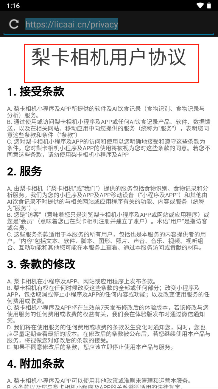 2、查看梨卡相机用户协议的详细内容。了解条款和条件后再使用应用。