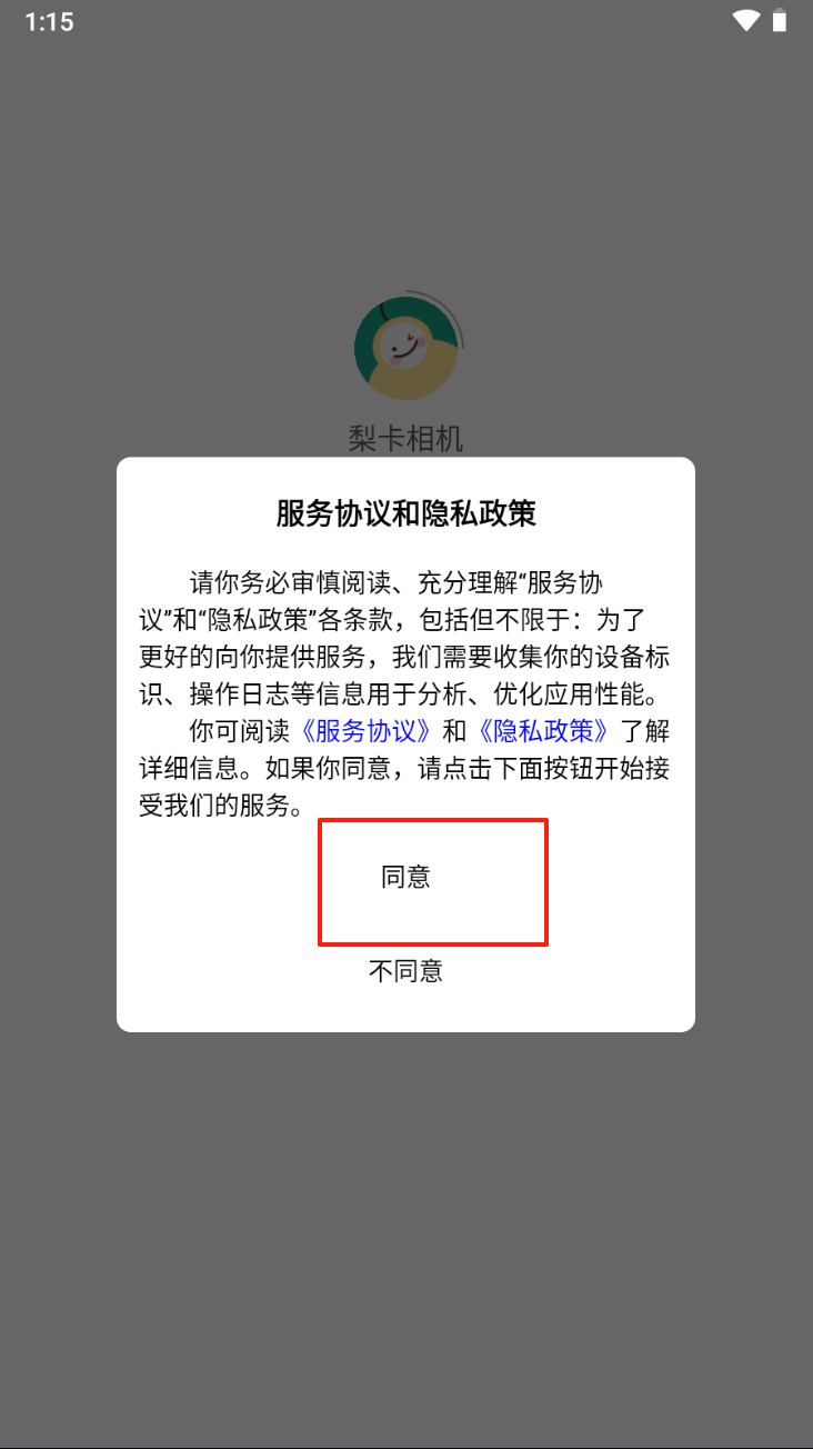 1、阅读并同意梨卡相机的服务协议和隐私政策。点击“同意”按钮以继续。