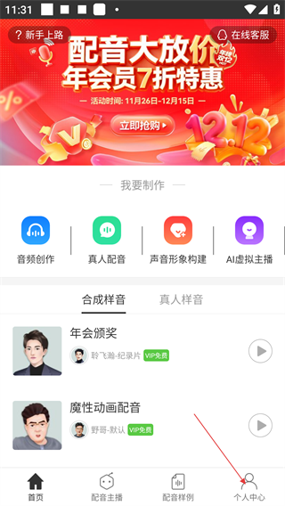 1、在首页底部点击【个人中心】,可进入个人功能页面,同时首页提供音频创作、真人配音等制作入口及样音资源。