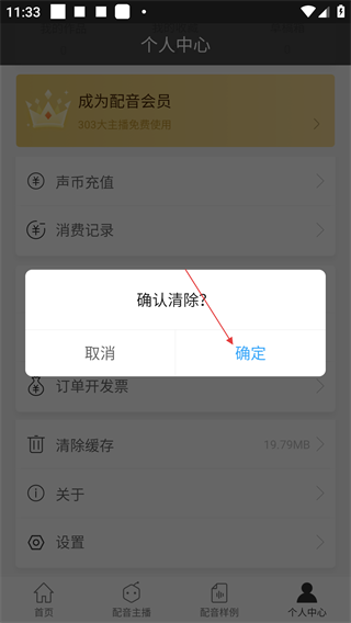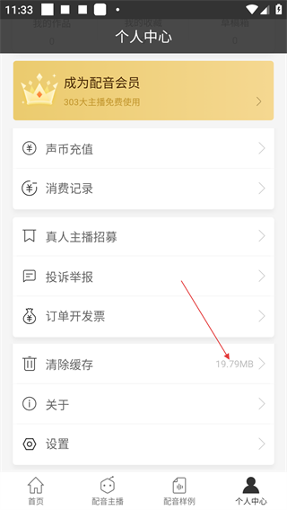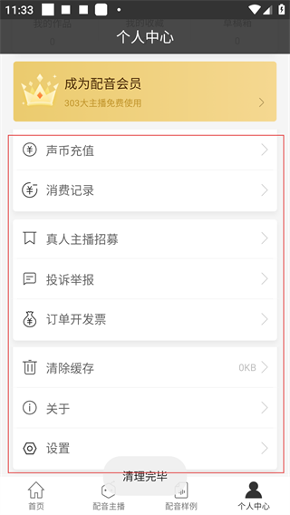2、进入【个人中心】后,可使用声币充值、消费记录等功能,还能通过【清除缓存】选项清理存储占用。