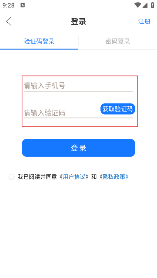 2、进入登录界面输入手机号和验证码。