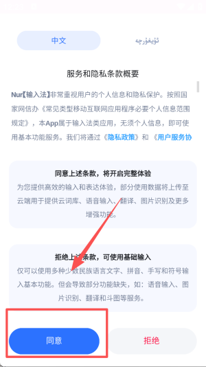 1、使用Nur输入法前,阅读服务和隐私条款概要,点击同意即可开启整体体验。