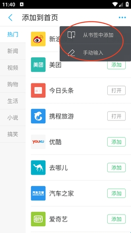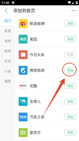 2、然后可以看到这里有很多常用网站,点击网站后面的“添加”就能一键添加到首页了。