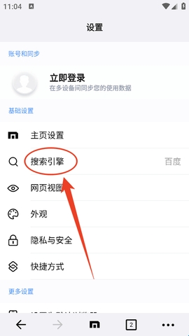 3、继续在设置页中找到“搜索引擎”,点击进入。