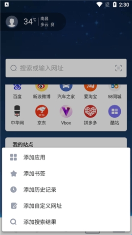 5、可以添加应用、书签、历史记录、自定义网址、添加搜索结果等。