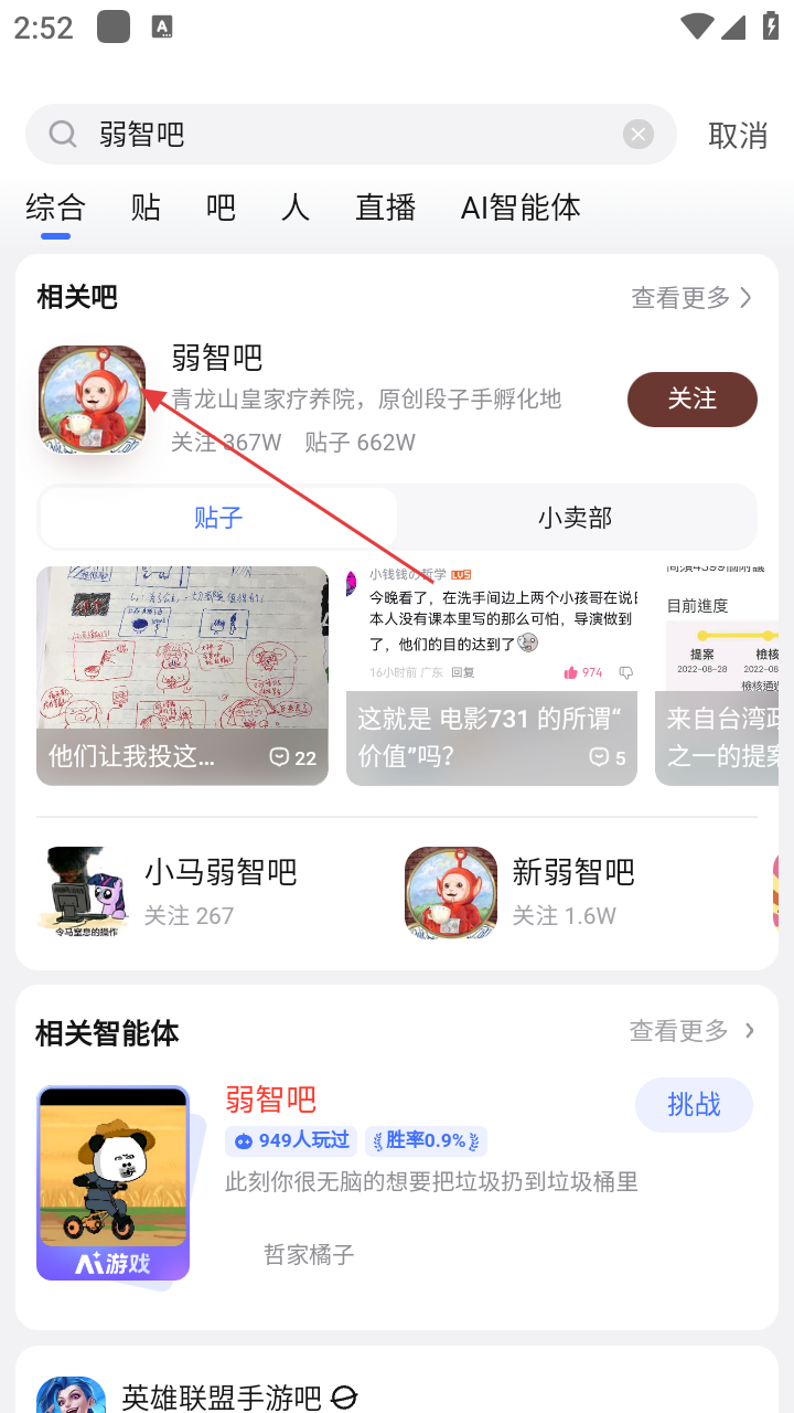 2、进入主界面后,在顶部搜索框中输入“弱智吧”,点击搜索,在搜索结果中,点击“弱智吧”进入该吧页面。