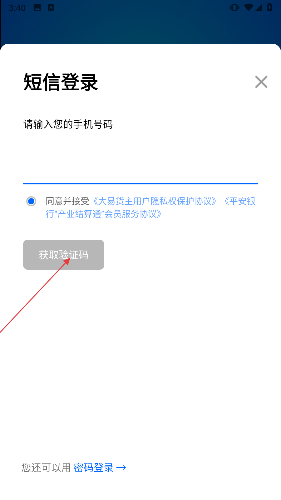 3、勾选同意相关协议的选项后,点击【获取验证码】按钮,继续完成后续登录步骤。
