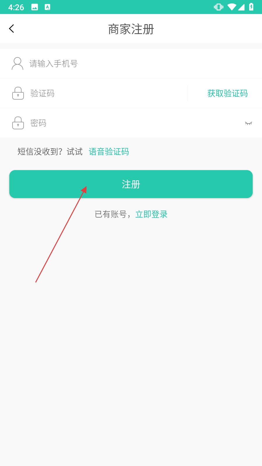 1、在登录界面点击右上角【注册】,进入商家注册页面。
