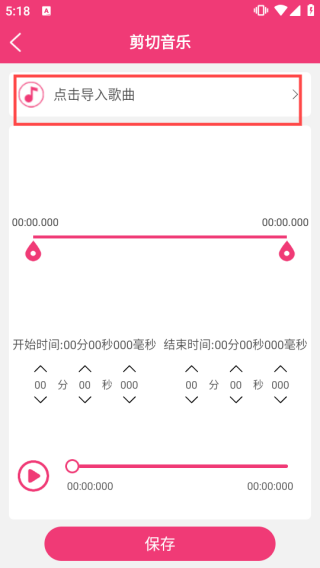 2、在剪切音乐界面,点击【点击导入歌曲】选择要裁剪的音频文件。