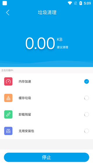 1、从当前页面完成应用安装并打开后,进入主界面选择“垃圾清理”功能,随即开始扫描内存空间及残留垃圾文件