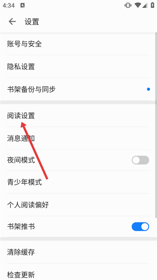 3、在设置界面,点击“阅读设置”选项,进入包含横屏双翻页、护眼模式等功能的阅读配置页面。