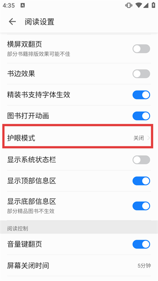 4、在阅读设置页面,点击“护眼模式”选项,可进入该功能的具体设置界面,调整阅读时的护眼参数。