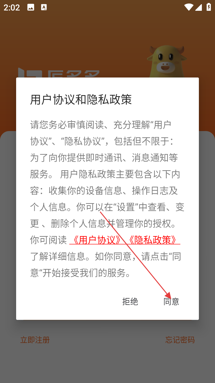 1、打开匠多多,阅读【用户协议和隐私政策】后,点击【同意】。