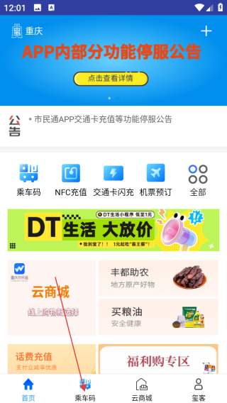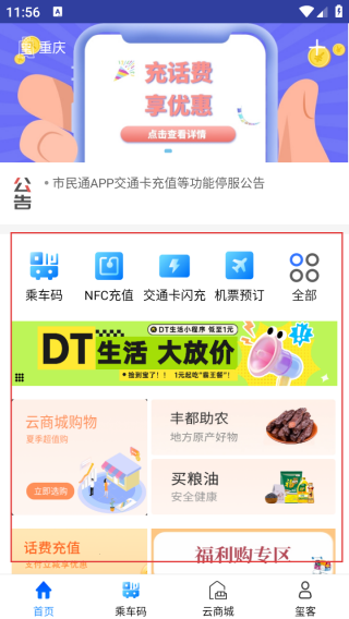 1、进入重庆市民通首页,可使用【乘车码】【NFC充值】等出行功能,也能通过【云商城购物】【话费充值】享受生活服务。