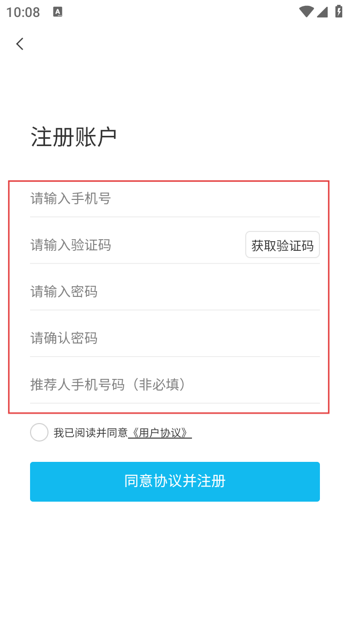 3、进入“注册账户”页面,输入手机号、验证码、密码等信息。