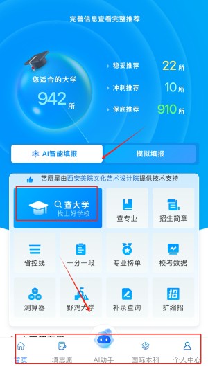 2、接着,点击“AI助手”图标,进入智能推荐页面,在这里可以查看适合您的大学推荐列表。