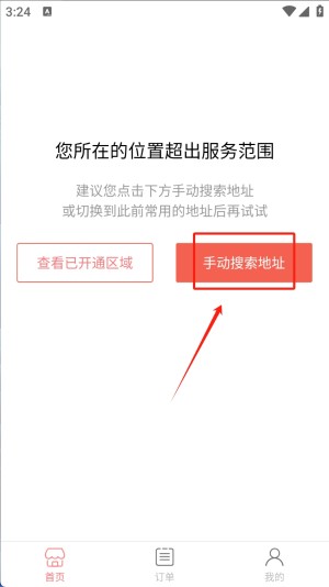2、接着,当提示您所在的位置超出服务范围时,点击“手动搜索地址”按钮,输入或选择一个在服务范围内的地址。