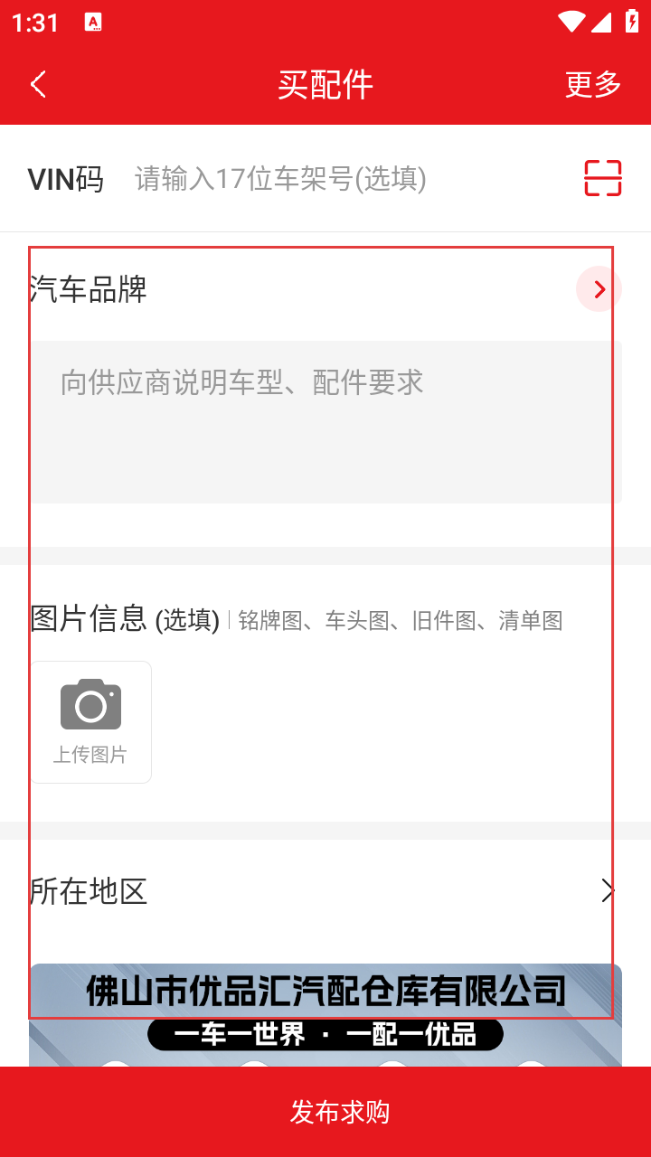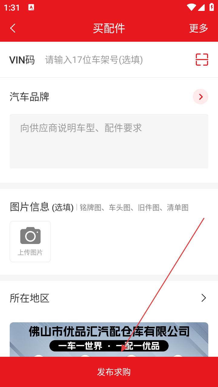 3、在【买配件】页,填【VIN码】选【汽车品牌】等信息,完善配件求购内容。