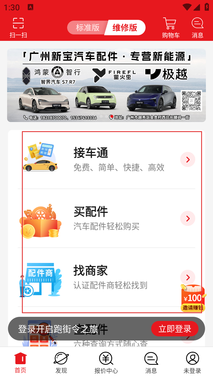 2、进入【维修版】后,按需选【接车通】【买配件】等服务,便捷解决需求。