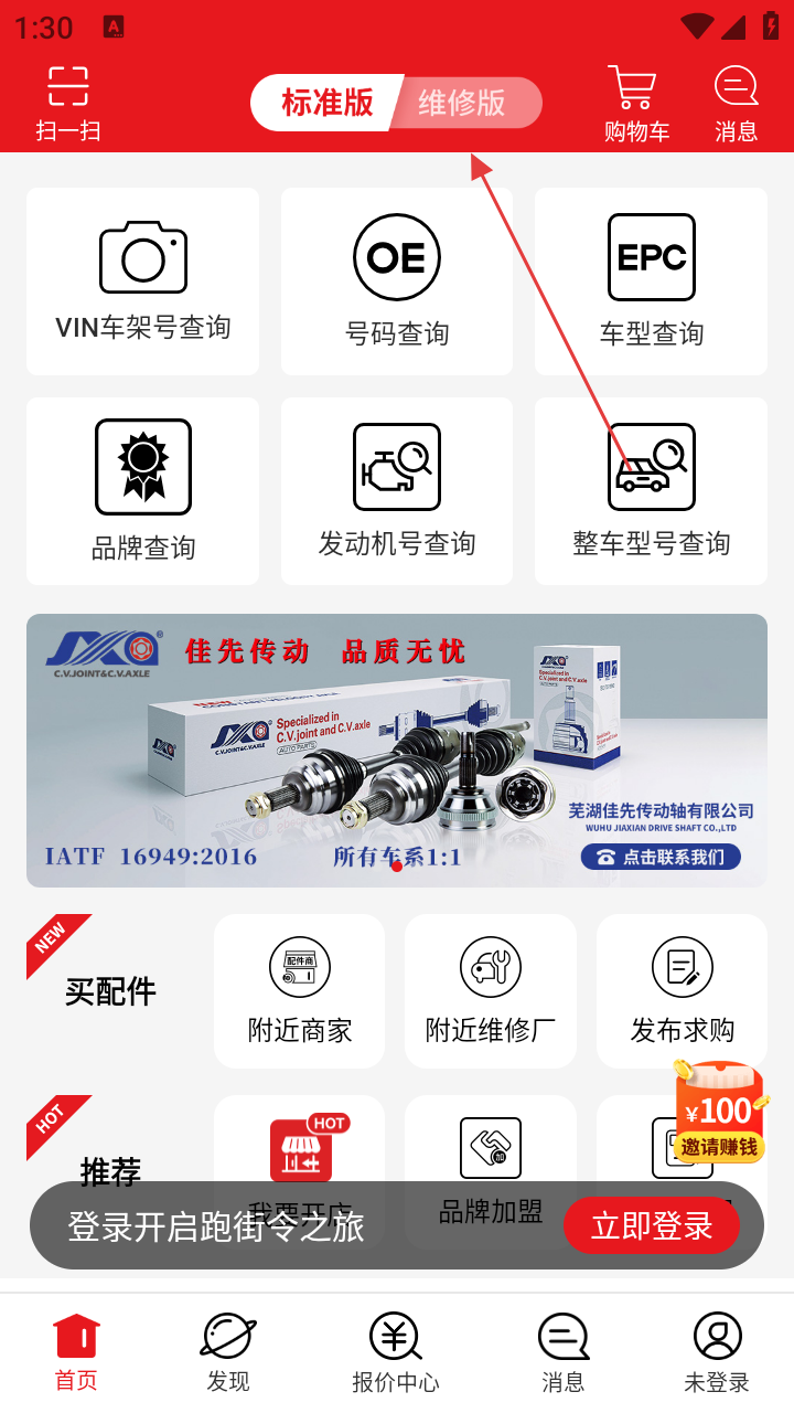 1、在首页点击【维修版】,切换至维修功能界面,可享专属服务。