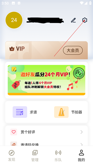 2、在个人页面点击右上角齿轮状设置图标,可进入设置界面,该页面还有邀好友瓜分VIP等活动入口及【求谱】【节拍器】功能。