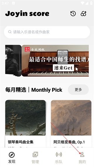 1、进入【乐其爱乐谱怎】后,可通过顶部搜索框输入乐谱名或作曲家找谱,点击底部【我的】可进入个人页面。
