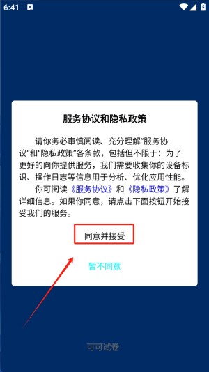 1、点击“同意并接受”按钮,同意服务协议和隐私政策。开始使用应用前的必要步骤。