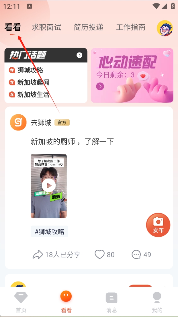 2、点击“看看”选项,查看热门话题和视频内容。