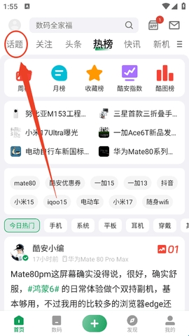 1、进入软件首页有,在导航栏找到“话题”,点击进入。