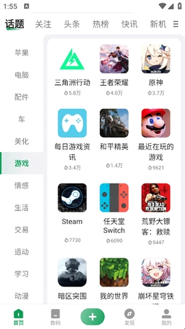 2、然后在“话题”版块找到“游戏”,可以看到这里有很多热门游戏。