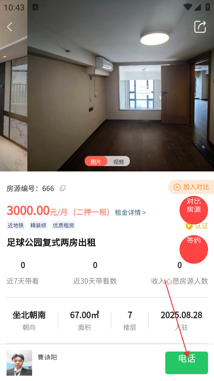 4、在房源详情页,能看到租金、面积等信息,若想联系,可点击【电话】按钮,与相关人员沟通。