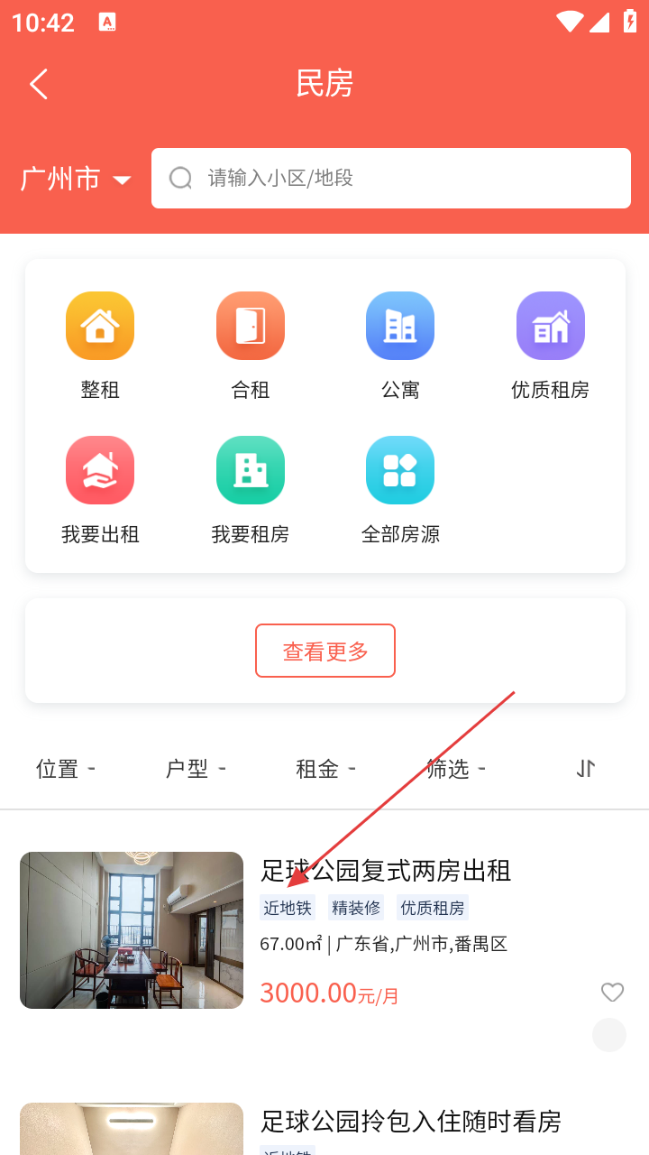 3、以民房为例,进入民房页面,可筛选整租、合租等类型,还能查看“足球公园复式两房出租”等房源信息。