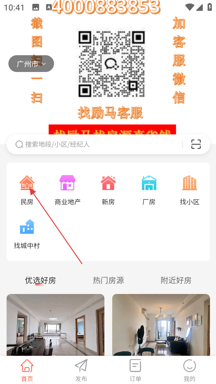 1、打开“找励马,进入首页,可看到民房、商业地产等房产类型入口,也能搜索地段、小区或经纪人进行选择筛选。