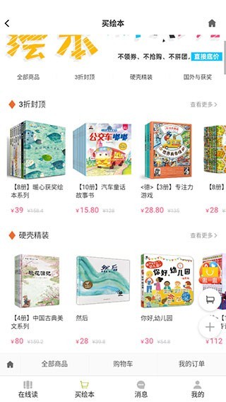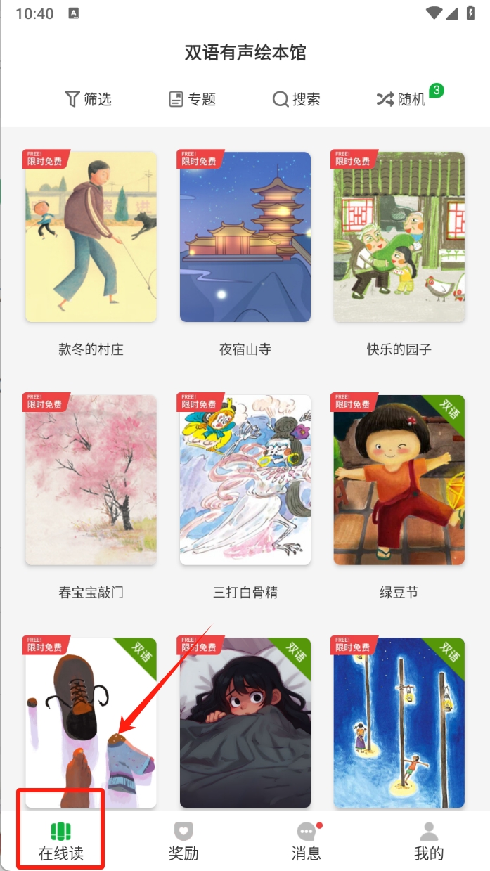 2、第二步:在首页,点击“在线读”图标,浏览可供阅读的绘本列表。这里展示了各种适合不同年龄段孩子的绘本。