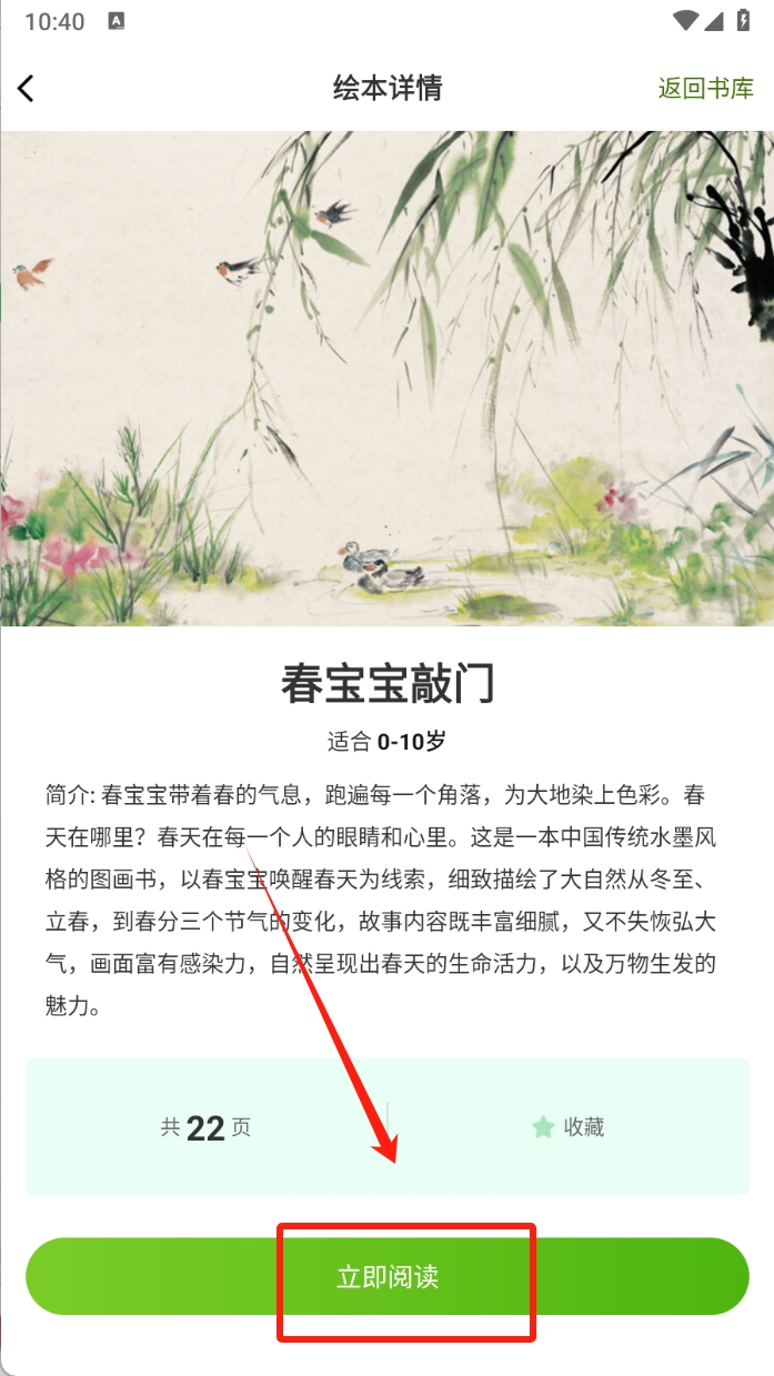 3、第三步:在绘本详情页,点击“立即阅读”按钮,开始阅读选定的绘本。你可以在这里享受丰富的绘本内容。