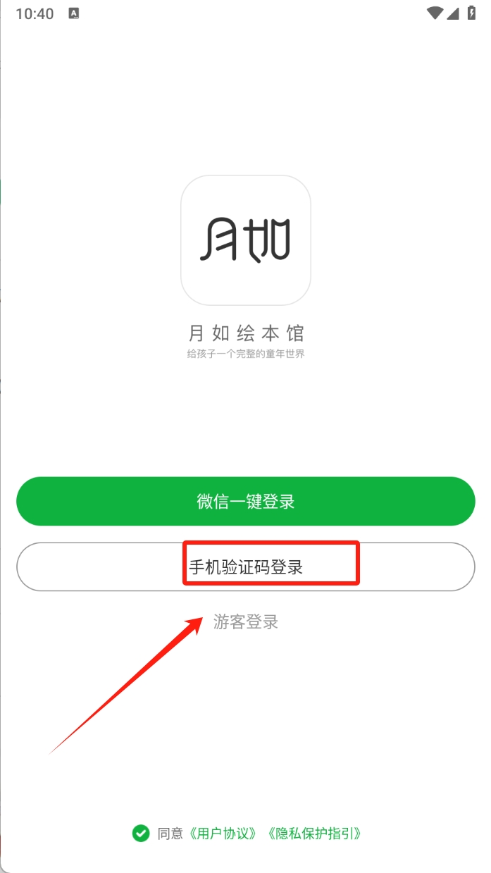 1、第一步:在登录页面,选择“手机验证码登录”或“微信一键登录”。这样可以快速进入月如绘本馆APP,开始使用。