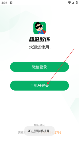 1、在【超级教练】登录页,点击【手机号登录】按钮进入手机号登录界面。
