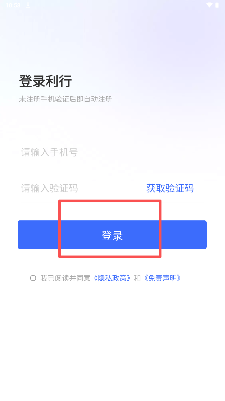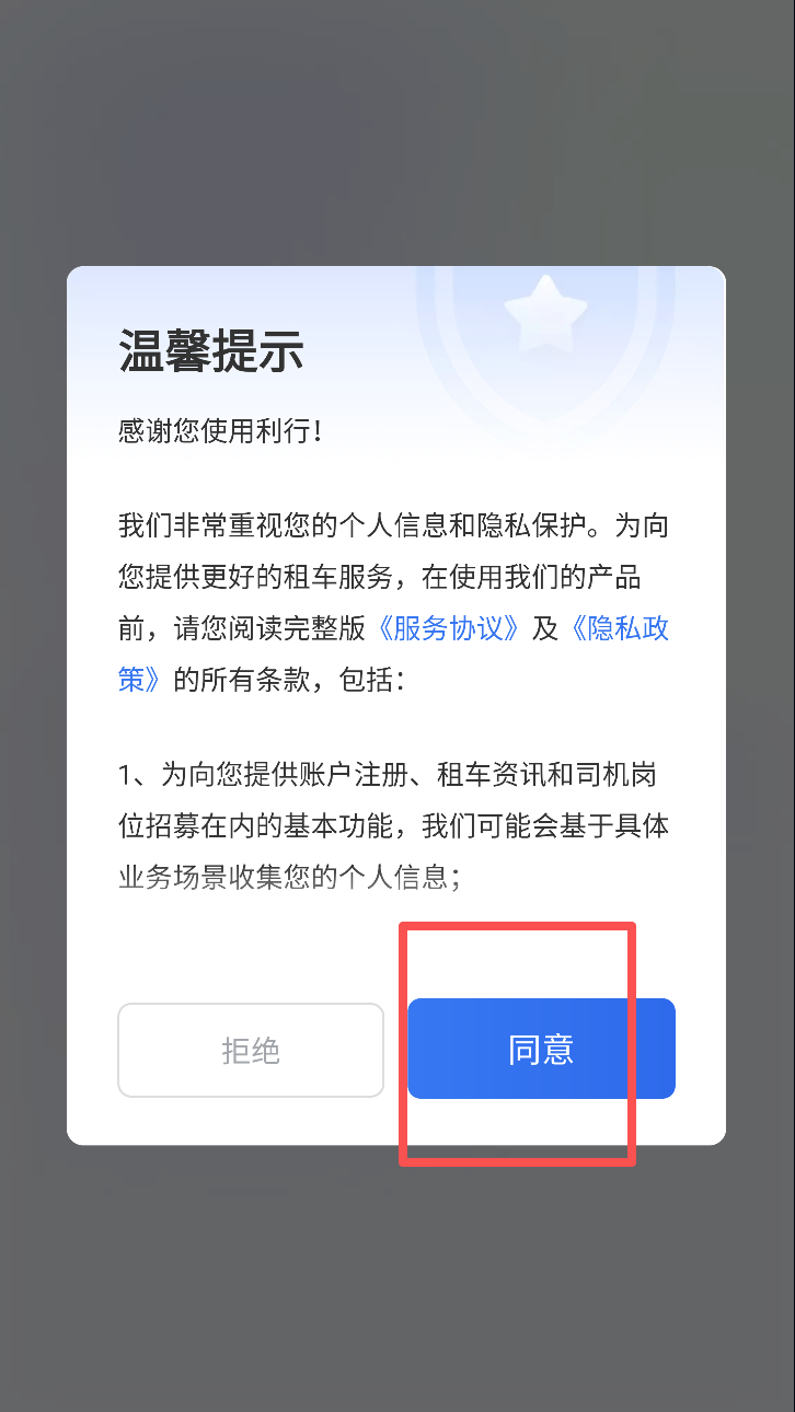 1、阅读并同意用户协议及隐私政策。点击“同意”按钮以继续使用利行服务。