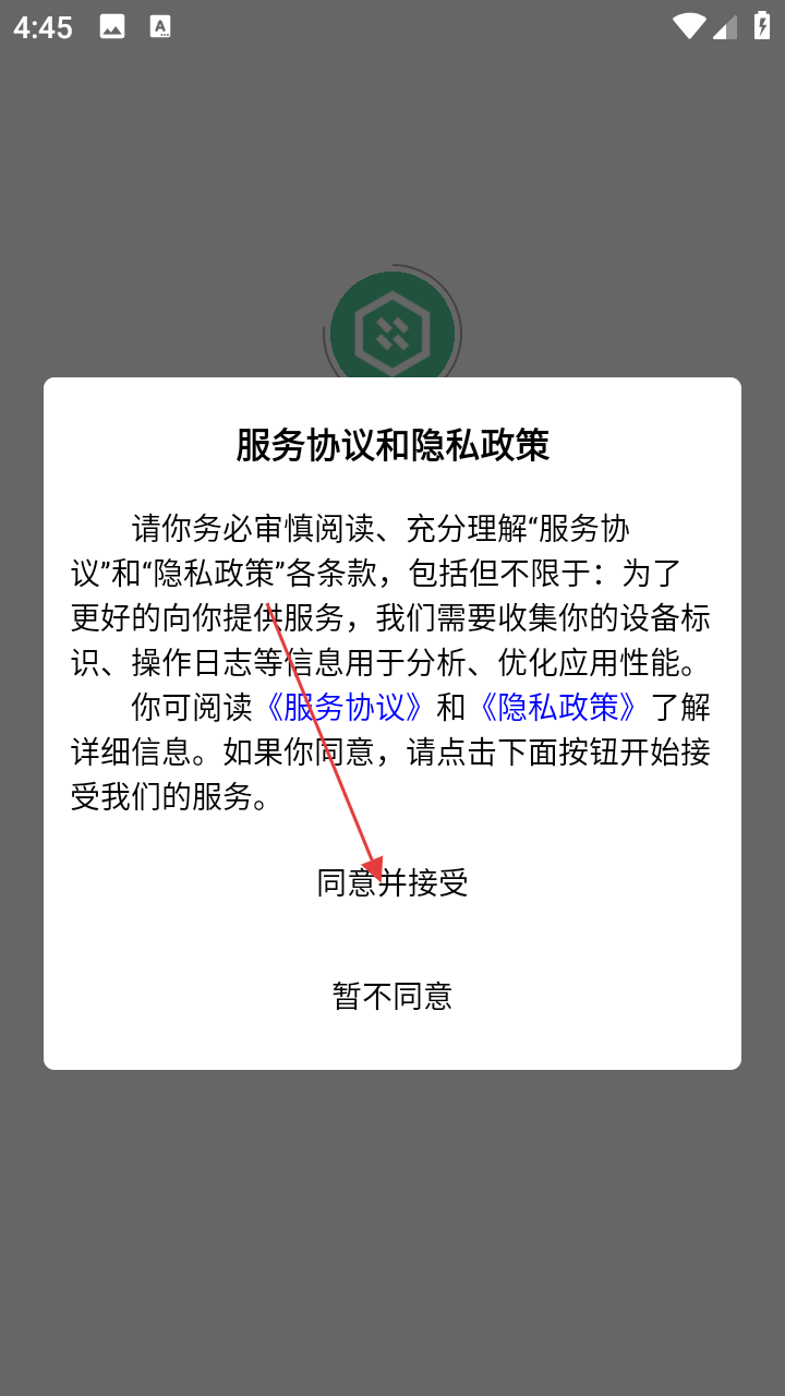1、打开远火,点击【同意并接受】服务协议和隐私政策。