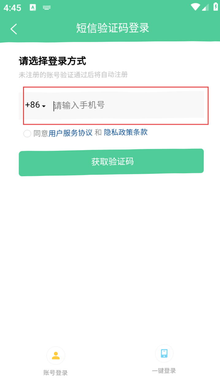 3、输入手机号,勾选同意用户服务协议和隐私政策条款。