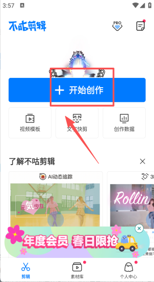 2、首页点击开始创作或选择快剪、视频模板进入编辑。