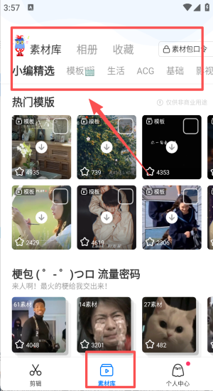 3、进入素材库可按分类挑选热门模板、生活或ACG素材。