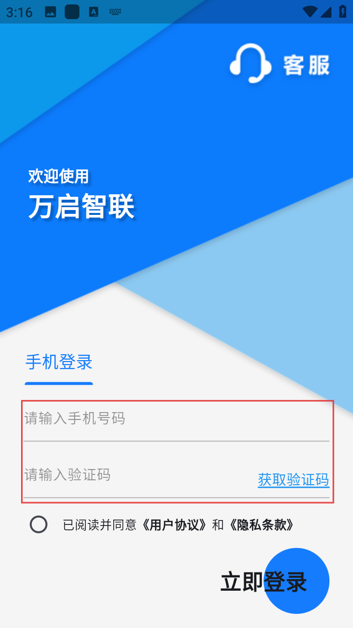 1、打开万启智联,输入手机号码,点击【获取验证码】并填入,勾选协议后点【立即登录】。