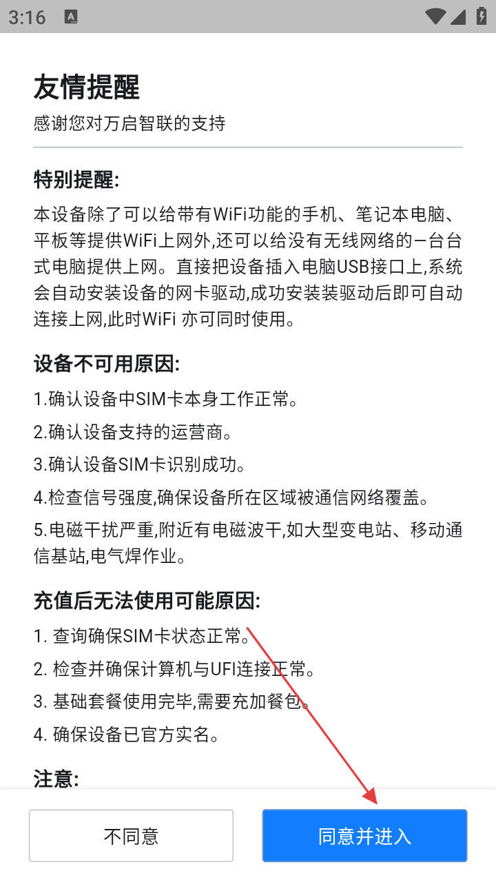 2、阅读友情提醒,点击【同意并进入】。