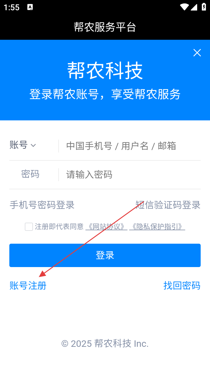 1、进入帮农服务平台,点底部【我的】,跳转登录页。