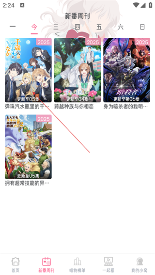 1、进入软件首页,可浏览《3年Z班银八老师》《电锯人》等推荐动漫,点击底部【新番周刊】。