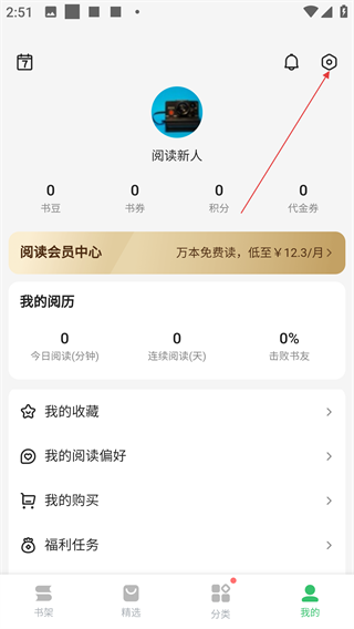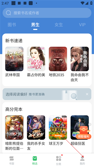 1、进入阅读应用精选页,可浏览【新书速递】【高分完本】等板块的书籍,点击底部【我的】进入个人中心。