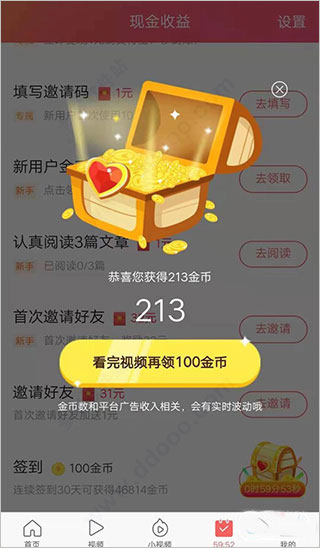 2、通过每日签到、阅读文章、观看视频、邀请好友等方式获得金币,累积后可兑换现金或礼品。