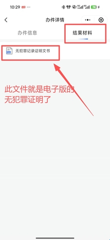 5、事项办结完成后办件状态会显示“已办结”,点击“结果材料”获取无犯罪记录证明文书,电子版和纸质版中只能选择一个获取。