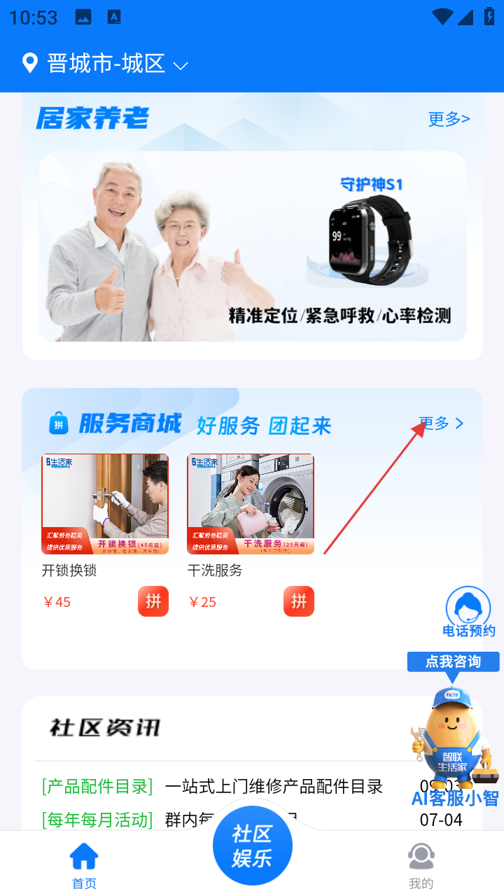 1、打开“智联生活家”APP首页,点击【服务商城】板块右侧的【更多】按钮。
